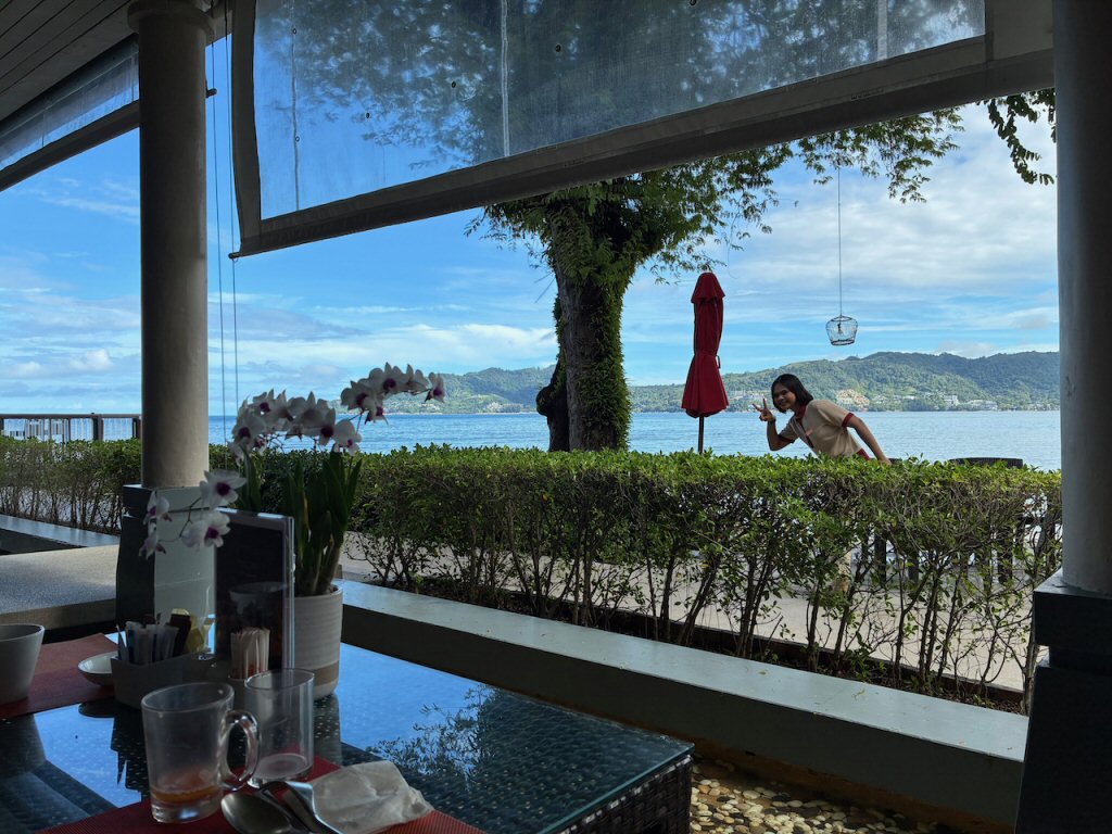 Photo TH-128: A view of the Andaman Sea (from inside the Rim Talay restaurant), photobombed by Cream 😊 (11-Oct-2025)