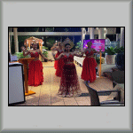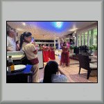 My last evening dinner, in the Rim Talay restaurant was a Caesar Salad, with additional prawns. While looking at the À la carte selection of the menu, and talking to Ryan (the Head Chef), a group of Amari staff girls walked in, and disappeared to the rear of the restaurant, where they obviously changed into traditional Thai costumes. They later emerged and performed a number of Thai dances. They then passed through the restaurant, where I had a photograph taken with them; see Photo TH-181.