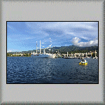 I awoke at 05h30 and stayed under the duvet, until going down for a breakfast at 07h30: a lovely French bread roll, butter, jam, fruit juice and a bowl of fresh fruit; see Photo PF-002. After an enjoyable breakfast, I ventured out to the fresh Tahitian air, and changed €60 into approximately 7,159 Pacific Frances at the airport's bureau de change, after which, I went for a bit of exploring before my planned lift to the port. At 10h50, a taxi (mini-bus) arrived at the motel, where a family of four and myself joined a couple already in the vehicle. Ten minutes after leaving the motel, we joined a bouchon in the centre of Papeete! [Traffic jams on a small Pacific island - unbelieveable!] At 11h20, the other passengers alighted at the ferry terminal; I alighted five minutes later at the quayside in the Place Vai'ete Park and Garden, where the French Polynesia Master was berthed - home for the next ten days! Although the published boarding time was 12h00, I was welcomed aboard early and shown to my cabin (number 11), where I met my roommate for the next 10 days; an American named Frank. Once all guests had arrived, and all formalities had been completed, we were divided into four groups, under the leadership of a dive master, rather than having a dive buddy. Marc was the leader of my group, which also included Frank, Richard and his girlfriend Milli (both from the United Kingdom). I was the only dive guest not qualified to dive with Nitrox. As the duration of the trip was 10 days, I asked if I could take the Nitrox course. "Mais Bien Sûre!" was the answer! Nitrox: Normal atmospheric air consists of 78% Nitrogen and 21% Oxygen (and 1% other gases). Nitrox, on the other hand, consists of a higher percentage of oxygen (sometimes as high as 40%), with a corresponding reduction of nitrogen. Reducing the proportion of nitrogen, by increasing the proportion of oxygen, reduces the risk of decompression sickness for the same dive profile. The Nitrox percentage of oxygen on board was set at 29%. For the check dive, and based on my most recent dives in Egypt, I started with 6 Kg of additional lead weight. However, when in the water, I couldn't submerge; I was too buoyant! I was therefore handed an additional 1.5 Kg, which did the trick! When breathing the Nitrox, I didn't notice any difference in breathing or taste, except knowing it was a safer mixture. The dive site for our check dive was supposed to have three wrecks, but we only saw two: a wooden boat and an aluminium aircraft. While underwater, I thought I saw a Manta Ray pass over our heads, but I was told it was a large Eagle Ray. I didn't have my camera with me, only it's case - to test whether it was watertight; which it was! After dinner, I retired at 21h00 and slept like a log!  |