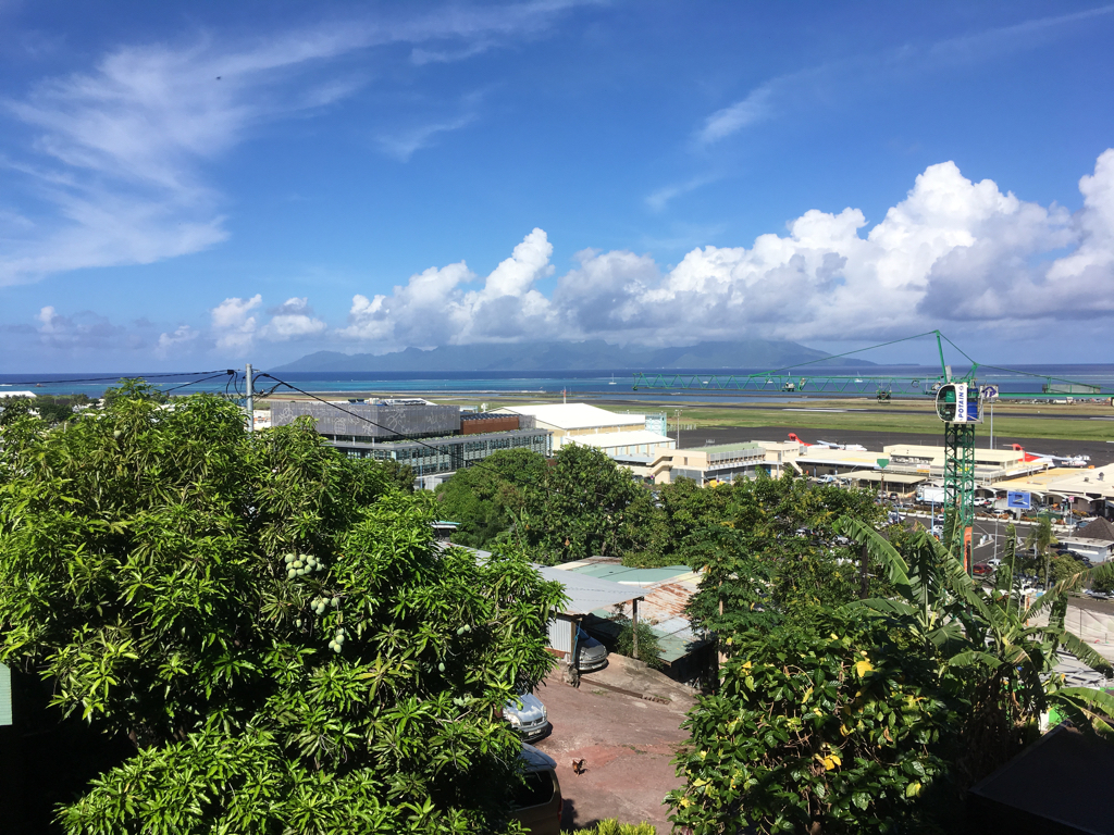 Photo PF-003: Looking West-North-West over the airport's runway, towards the island of Mo'orea (19-Dec-2018; 08h16)