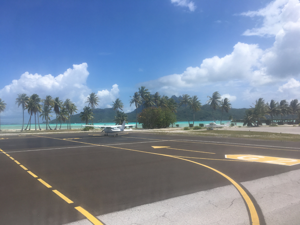 Photo PF-023: Goodbye Bora Bora, with Mont Otemanu and the twin peaks of Mont Pahia behind the trees (22-Dec-2018; 13h28)