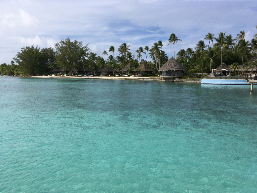 Photo PF-040: Part of the lagoon frontage (including Bungalow 56 (second from the left)) at the Hotel Kia Ora Resort and Spa (24-Dec-2018; 15h51)
