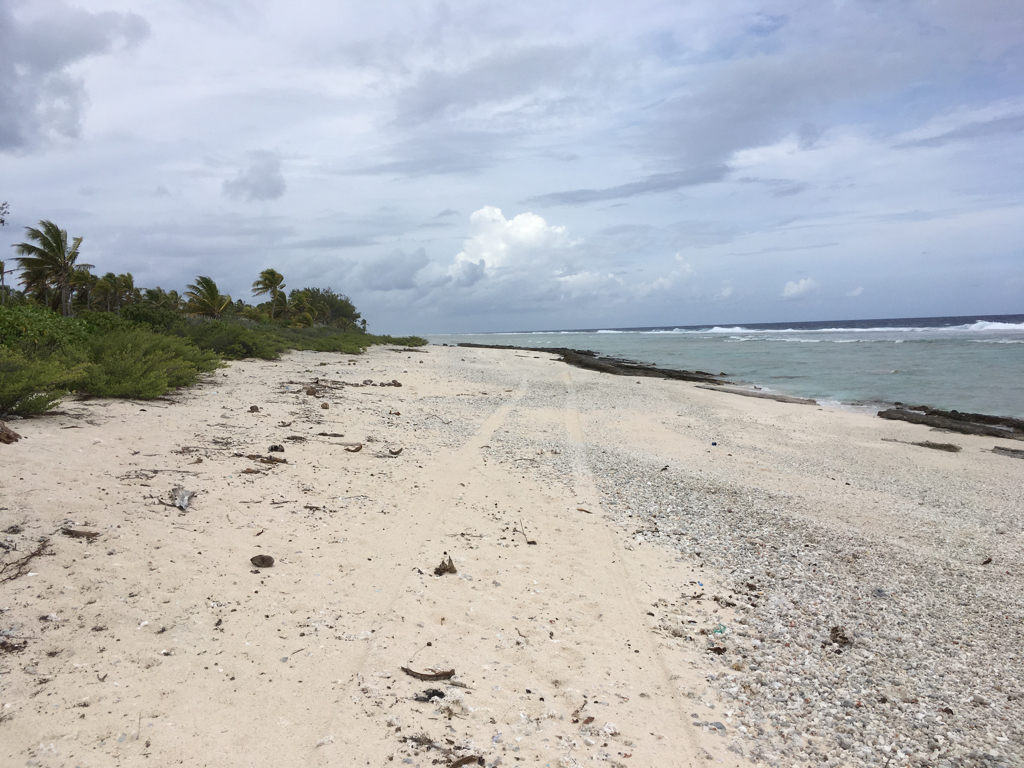 Photo PF-046: Looking north-west along a plastic-free beach, on the northern coast of Rangiroa Atoll (25-Dec-2018; 09h06)