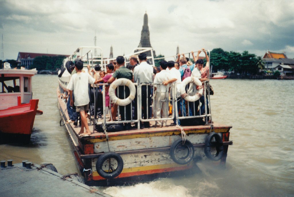 Photo TH-005: A Chao Phraya River Taxi. The conductor (the child hanging on at the left-rear)conveyed his instructions to the driver, at the front of the boat, using a whistle (07-Jul-1993)